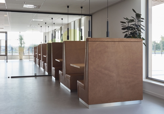 Ook zijn er oude vergaderstoelen en –tafels ‘refurbished’; ze zijn voorzien van een nieuwe stoffering die aansluit bij de stijl van het nieuwe pand. Oude roldeurkasten van Eosta zijn hergebruikt door ze te voorzien van een nieuwe ombouw; die bestaat bovendien uit plaatmateriaal dat bio-based en recyclebaar is. Het binnenwerk van de pantry’s is vervaardigd uit Ecor, een gerecycled en lichtgewicht product.