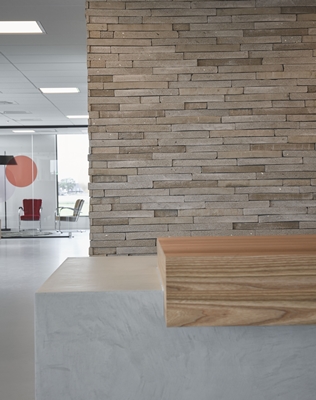 Alles in het interieur is demontabel is, met oog op recycling of hergebruik aan het einde van de gebruiksperiode, zegt Ex. Dat geldt voor de kantoorstoelen en –tafels, maar bijvoorbeeld ook voor de stenen wandbekleding rond de openhaarden. Die stenen, gemaakt van vergruisd oud porselein en keramiek, zijn niet gevoegd zodat ze later makkelijk van de wand zijn af te halen zijn en weer gerecycled kunnen worden.