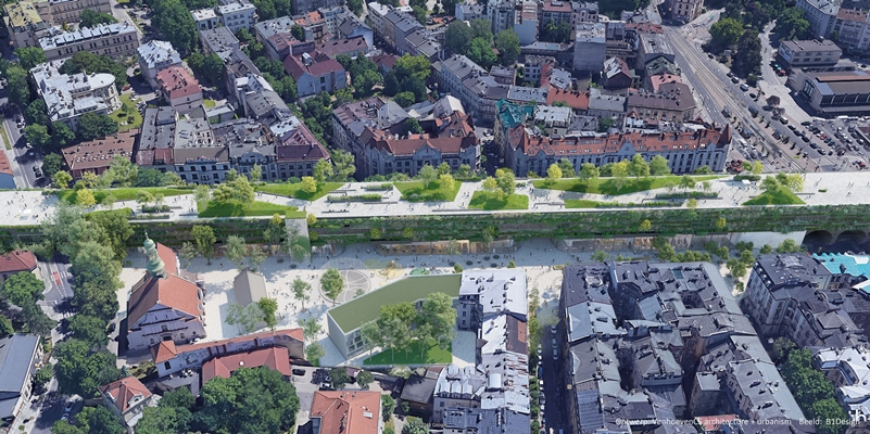 De groene structuur op de bovenste lagen is mede bedoeld om de aanzet te geven tot een tweede groene ring in Krakau. De eerste ring werd geïntroduceerd in de negentiende eeuw om het historische centrum te structuren en eenheid in de verscheidenheid te bieden. Mits juist ontwikkeld kan het spoorviaduct eenzelfde betekenis hebben voor het momenteel groeiende Krakau, aldus VenhoevenCS.