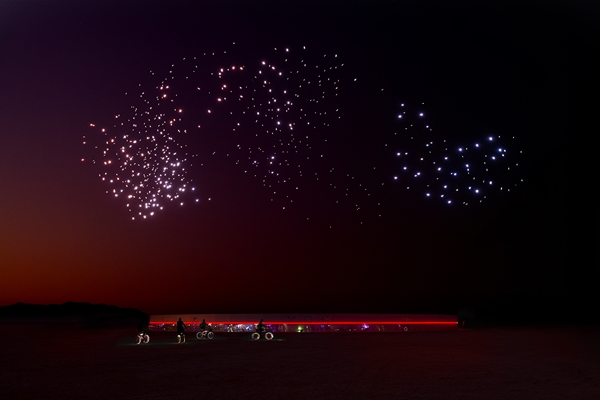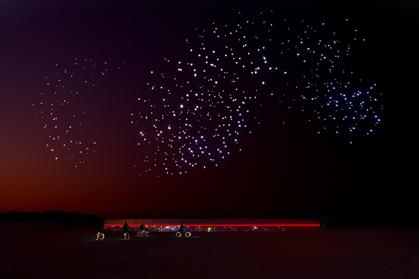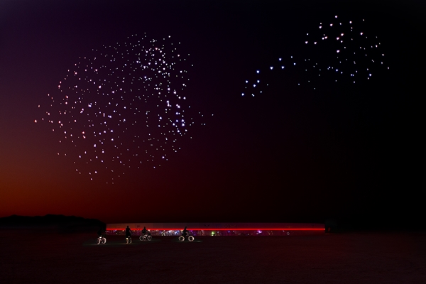 . In de duisternis boven de tijdelijke ‘Black Rock City’ in een woestijn in Nevada voerden zeshonderd drones een choreografie uit, onder muzikale begeleiding van pianist Joep Beving.