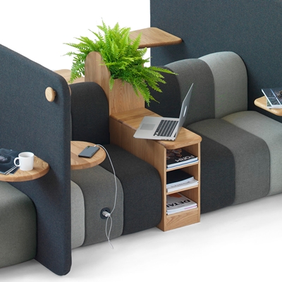 In een kantooromgeving waar mensen geen vaste plek meer hebben is de Addit Bento van Dataflex International een interessante oplossing. Het product is geïnspireerd op de Japanse lunchtrommeltjes: je kunt er je eigendommen in opbergen en meenemen naar een andere werkplek, maar tegelijkertijd fungeert de Addit Bento als monitorstandaard. De deksel, onder verschillende hoeken schuin te plaatsen, kan ook een tablet ondersteunen. Voor het werken en overleggen in de zithoek heeft Blå Station zijn modulaire bank Bob aangevuld met modules voor bergruimte en kabelaansluitingen, de Bob Job.