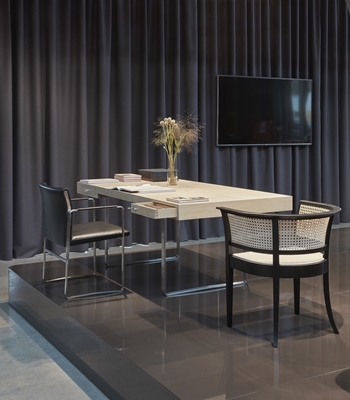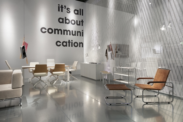 Ook Thonet spelt in op de vervaging tussen vrijetijds- en werkomgeving. Zitten we enerzijds tegenwoordig met onze laptop te werken in een hippe koffiebar, anderzijds: ‘Büros sind die neuen Kaffeehäuser’, zoals op een wand van de stand staat. Thonet leverde al in de 19e eeuw stoelen aan de koffiehuizen, nu blijken de meubels prima toepasbaar in de kantooromgeving. Van een aantal series brengt Thonet nieuwe uitvoeringen gepresenteerd, zoals van zitmeubelserie 404, ontworpen door Stefan Diez, voor cafés, kantines en informele plekken en sofaserie S 5000 van James Irvine voor wacht- en loungeruimten. Nieuw is de compacte fauteuil 809 van Formstelle – een coompacte variant op loungefauteuil 808 – die bedacht is voor bijvoorbeeld wachtruimtes en ontspannen overleg.