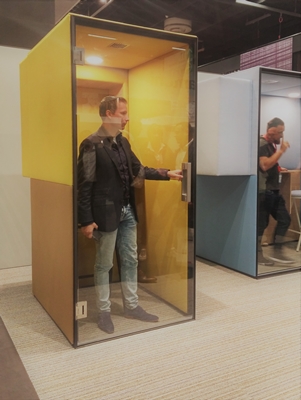 Bij alle open kantoorvloeren en informele overlegplekken is er ook behoefte aan de mogelijkheid tot afzondering. Tijdens de Stockholm Furniture Fair, eerder dit jaar, zagen we vele ‘stiltecellen’. Dergelijke kleine geluiddempende ruimtes, geschikt voor een (gevoelig) overleg, een telefoongesprek of misschien wel een powernap, waren minder te zien op Orgatec. Palau – dat sinds begin dit jaar onderdeel is van Casala – introduceerde wel de Boston, uitvoerbaar in verschillende groottes en met opties als een bergruimte of tafeltje. MDD toonde de compacte, driehoekige belcel Hana.
