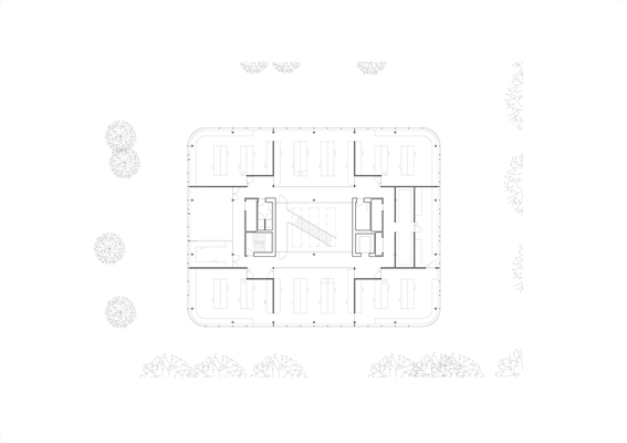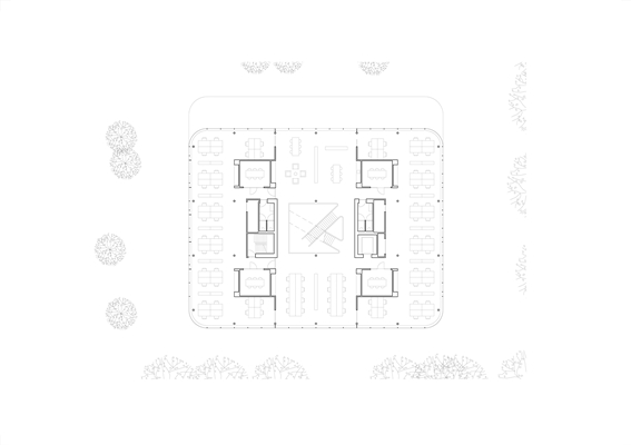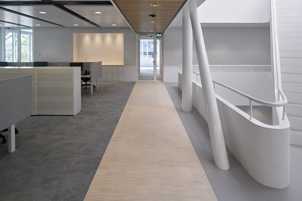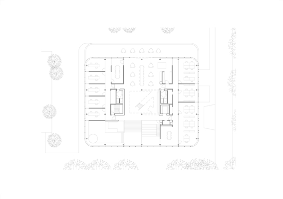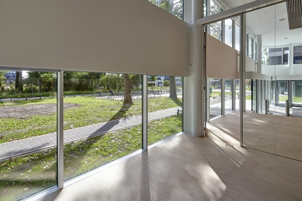 Een atrium verbindt als hart van het gebouw de verschillende verdiepingen. Diagonaal geplaatste trappen en ‘snelle’ routes moeten de gebruikers uitnodigen tot een actieve manier van werken en beweging door het gebouw. De dynamiek wordt versterkt door het afwisselende zonlicht dat de hele dag diep het gebouw binnendringt.