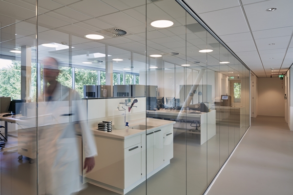 Het karakter van het gebouw ontwikkelt zich gradueel per verdieping. Waar de entree en lobby open en uitnodigend zijn, is de bovenste verdieping met laboratoria afgeschermd. Op de tussengelegen verdieping vindt in open en ruime kantoorvelden DNA-analysewerk plaats. Trappen en vides begeleiden de beweging door het gebouw en zorgen voor eenheid tussen de verschillende sferen.
