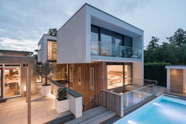 De omsloten buitenruimte heeft het architectenbureau ontworpen als een verlengstuk van het interieur. Hout als bekleding versterkt dit idee. De patio bevat een jacuzzi, loopt trapsgewijs op en is een verbinding naar het zwembad in de tuin.