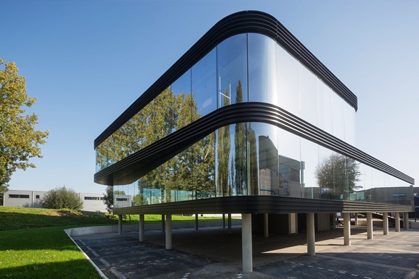 Het optillen van het volume op ‘pilotis’ om ruimte te maken voor het parkeren lijkt op het eerste gezicht een zwaktebod, maar ondergraaft het architectonisch concept uiteindelijk niet. Door het parkeren half verdiept onder het gebouw te leggen, kijken de gebruikers over de auto’s heen naar het groen erachter. Ook versterken de ‘pilotis’ de dynamiek van de gewikkelde gevel, vooral op de momenten dat er wat minder auto’s staan.