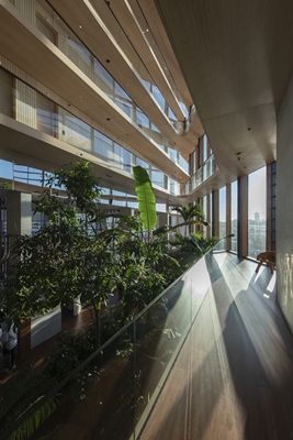 Ook is de jury bijzonder enthousiast over de detaillering van het hotel: het bamboe op de vloer, overal houten wanden, de verlichting, de afgeronde betonnen trappen, de afgeronde hoek aan de voorzijde… het klopt overal. Ook kun je, als je goed kijkt, in de gevel zien dat het gebouw opgebouwd is uit modules. Wel zo eerlijk, vindt de jury.