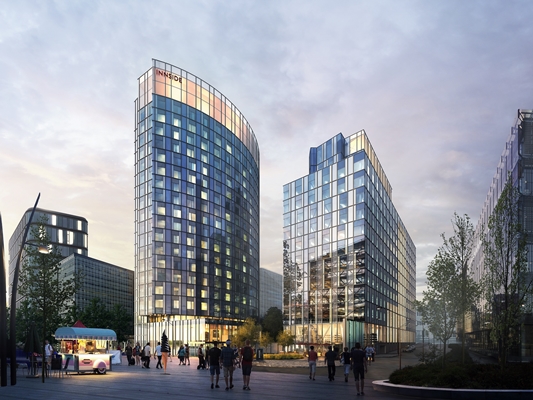 De kantoortoren, die net als het hotelgebouw gaat voldoen aan duurzaamheidslabel BREEAM Excellent, krijgt vrije vloervelden met hoogwaardige kantoorruimte voor meerdere gebruikers. Dankzij een groot atrium dringt daglicht diep het gebouw binnen en ontstaat ruimte voor interactie tussen de verschillende kantoorvloeren, meldt KCAP.