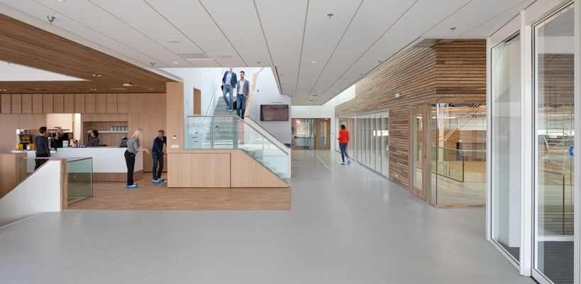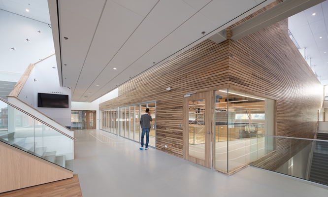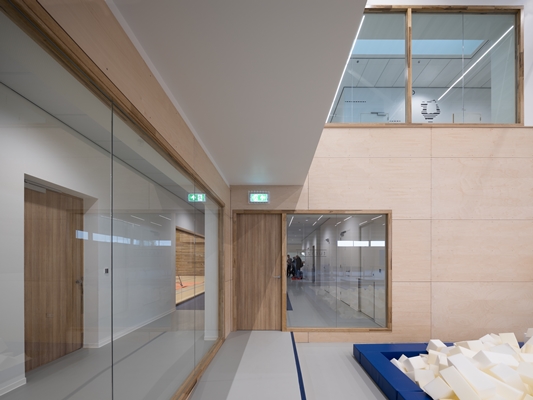 Bij binnenkomst krijgt de bezoeker via doorkijkjes een ‘teaser’ van wat zich in het gebouw afspeelt. Op die manier wordt direct duidelijk welke functies zich waar bevinden en kunnen bezoekers zich gemakkelijk, verklaart VenhoevenCS. De ‘echte’ binnenkomst van het gebouw bevindt zich op de eerste verdieping; dit is tevens het hart van het sportcentrum.