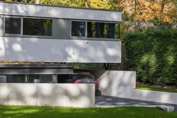 Aan de voorzijde van de woning heeft is een verdiepte carport met sedumdak gerealiseerd. De in het werk gestorte betonnen keerwand loopt door tot aan de achterzijde van de woning en begeleidt de trappen naar de entree en het bestaand terras aan de achtertuin.