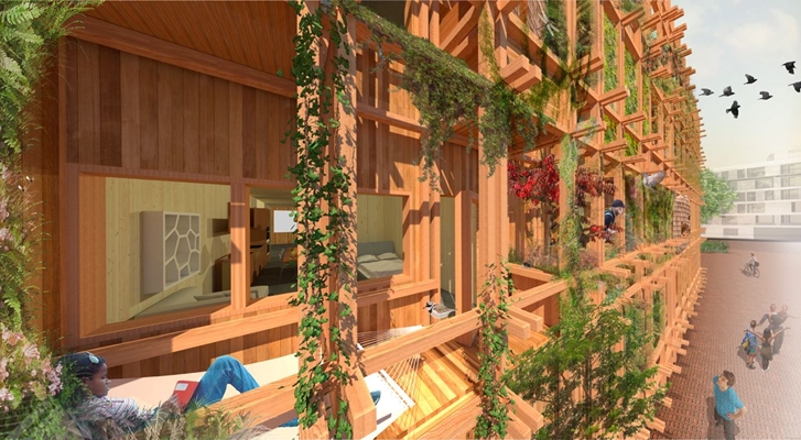 De buitenzijde van het woongebouw moet “een echt nieuw stuk stadsnatuur” worden, aldus de wooncoöperatie en Natrufied Architecture. Het exterieur zal volgens hen bovendien circulaire energie, biobased bouwmaterialen en een functionerende biotoop bij elkaar brengen.