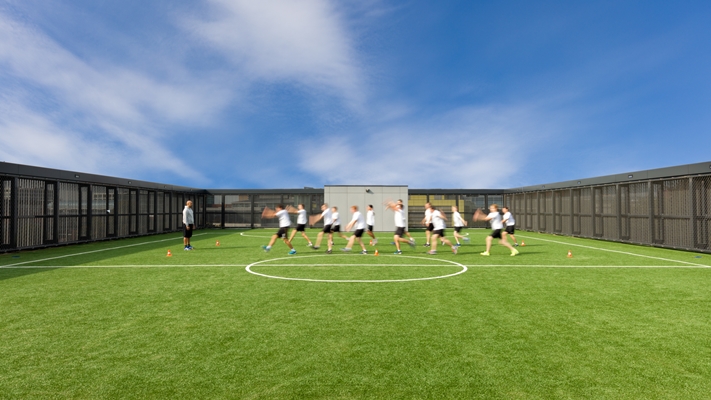 Het sportveld bestaat uit een kunstgrasveld van 25 x 40 meter en is rondom afgeschermd door een omheining uit een geprofileerde en geperforeerde gevelplaat. Die is speciaal voor dit project ontworpen en vervaardigd, vertelt het architectenbureau. Het scherm biedt veiligheid en vangt de wind op, terwijl het semitransparante karakter ervoor zorgt dat de sporter op het dak contact houdt met de omgeving.
