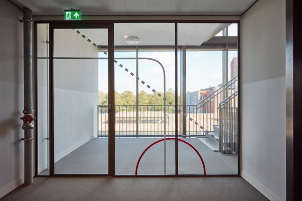 Buiten wordt naar binnen gebracht om de aansluiting te vinden bij het ‘normale’ leven buiten het zorghotel. Met name in de publieke zone is het makkelijk om ‘mensen van buiten’ te ontmoeten, legt Van Eijk & Van der Lubbe uit; ook wordt de betrokkenheid van de omgeving bij het verblijf in Domstate gestimuleerd. Zo kunnen thuissituaties voorzichtig worden getraind, zonder het etiket revalidatie erop.