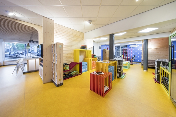 Dit vormde de inspiratie voor het realiseren van een ontspanningszone op de patio, samengesteld uit de kleurige modules. De installatie vormt een aanvulling op het interieur, harmonieert met de architectuur van het gebouw en biedt de leerlingen een creatieve omgeving om hun vrije uren door te brengen.