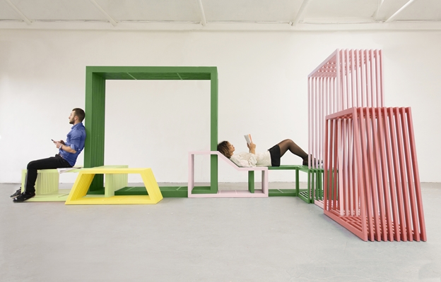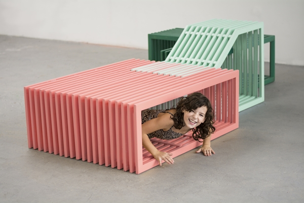 introduceerde een aantal jaren geleden Intersections, een reeks modulaire objecten waarmee functionele installaties in de buitenruimte zijn te creëren. Inmiddels is Intersections ook een aantal malen in een interieur toegepast en heeft de kunstenares-ontwerpster daartoe een speciale serie ontworpen.
