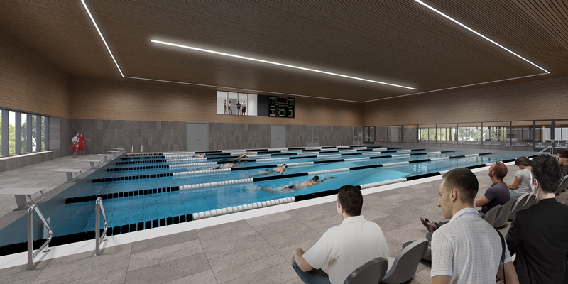 , komen een sporthal en twee zwembaden. Centraal in het gebouw komen horecafaciliteiten met uitzicht op de genoemde functies.