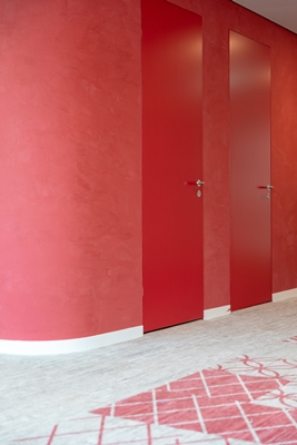 De wat moeizame overgang tussen architectuur en interieurarchitectuur is binnen goed zichtbaar op de grens tussen de kantoorvloeren en de kernen. Op verzoek van Benthem Crouwel Architects heeft iedere kern zijn eigen, felle kleur gekregen, waarbij die kleur zowel de wanden, vloeren als plafonds beslaat. In het concept van D/Dock voor de kantoorvloeren hebben de wanden, vloeren en plafonds echter ieder een eigen identiteit gekregen. Sterker nog, de meanderende wand is zelfs los gehouden van het plafond. Het gebouw heeft daarmee toch meerdere gezichten gekregen.