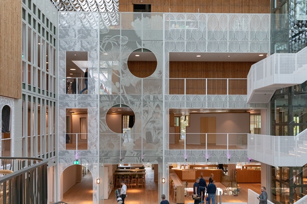 Bijzonder aan het ontwerp van het atrium is dat Benthem Crouwel Architects daarbij echt uit zijn comfortzone is getreden. De geabstraheerde ‘panden’ staan in stevig contrast met de zakelijke buitenzijde van het gebouw. Dat contrast blijft uiteindelijk echter wel wringen. En dat geldt ook voor het interieur, dat weer een net ander verhaal vertelt. Iets wat wellicht voorkomen kunnen worden als de interieurarchitect eerder in het proces was aangehaakt.