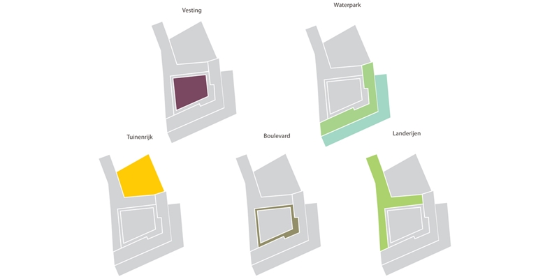 Het omliggende oude landschap wordt gekenmerkt door verdedigingslinies, forten en bastions. Hiernaar verwijst een aantal bijzondere wooncomplexen die als forten in het park aan de Groote Wielenplas liggen.