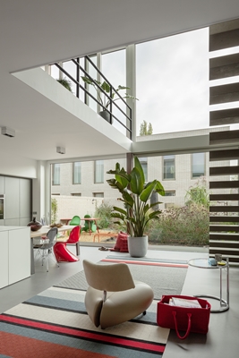 Aan de voorzijde zijn de gevels van de woningen vrij gesloten, terwijl ze aan de kant van de tuin over een glazen gevel beschikken. Dankzij twee grote schuiframen is de woning niet alleen visueel, maar ook fysiek met de buitenruimte verbonden. De ommuurde tuin is ongeveer vijftig vierkante meter groot en heeft de sfeer van een patio, meldt Atelier Kempe Thill.