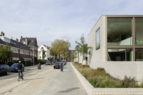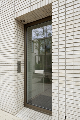 De witgele baksteengevel is gecombineerd met brons geanodiseerde aluminiumkozijnen, die zijn voorzien van zonwerende beglazing en geïntegreerde grijze zonneschermen.