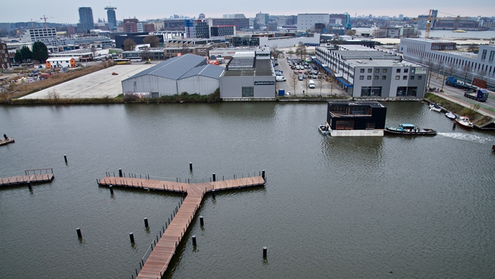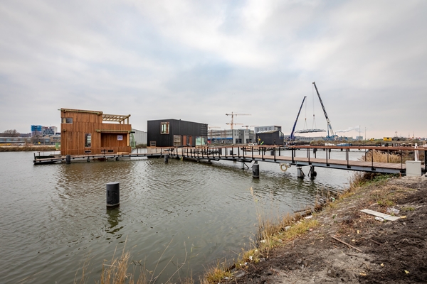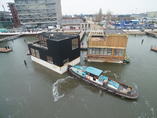 in Amsterdam-Noord op hun plek gevaren. De wijk met in totaal 46 woningen verrijst de komende twee jaar in het Johan van Hasseltkanaal. Architectenbureau