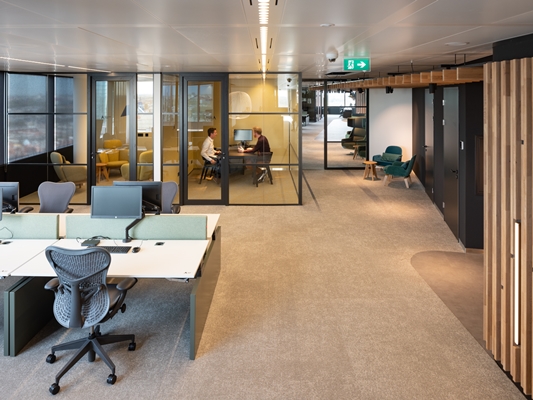 Op de open werkvloeren worden de flexwerkplekken afgewisseld met kasten en planten-frames. Tevens is er een aantal kleine overlegruimtes met aangrenzende skype- of concentratieplekken, voorzien van akoestische viltwanden. De werkvloer heeft een gevarieerd aanbod aan werkplekken.