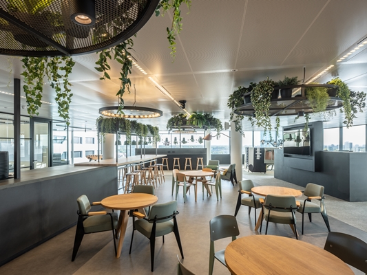 Het groen is toegepast in het hele kantoor en op verschillende wijzen, van hangende tuinen in het werkcafé en geïntegreerde plantenbakken bij de koffiebar tot ruimtescheidende plantenframes in het werkgebied.