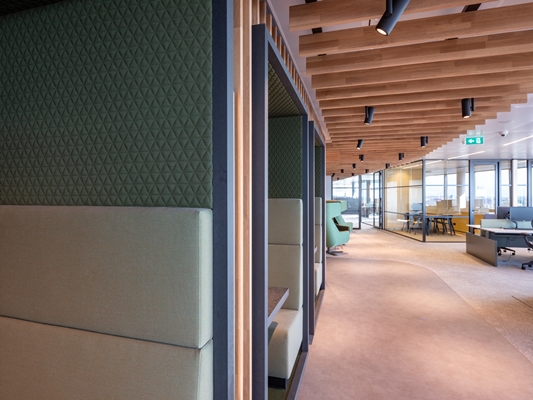 Het architectenbureau heeft onder meer gekozen voor C2C Silver-gecertificeerd tapijt en als bekleding van de opgedikte kern voor massief eiken latten, FSC-gecertificeerd en met natuurlijke olie afgewerkt). Het hout zorgt voor een natuurlijke, warme aanvulling in het interieur.