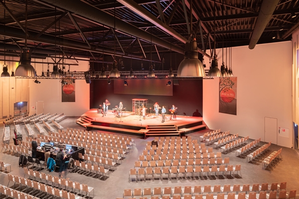 Kerkgebouw met podium voor muziek