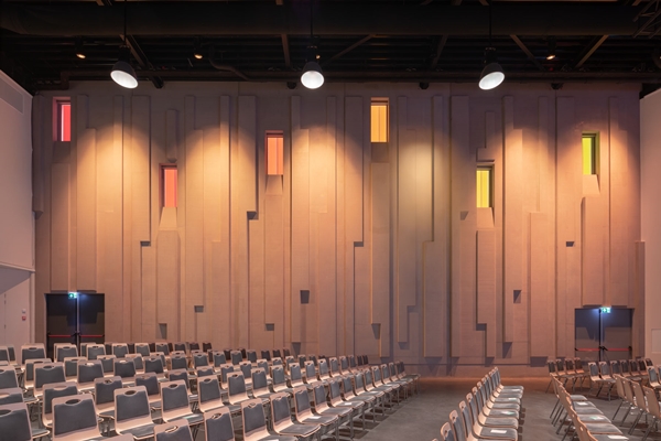 01-10 Architecten ontwierp een groot podium, dat plaats kan bieden aan de reguliere muziekband of een volwaardig koor. Met het oog op een veelzijdig gebruik is de zaal uitgerust met een professionele geluids- en lichtinstallatie.