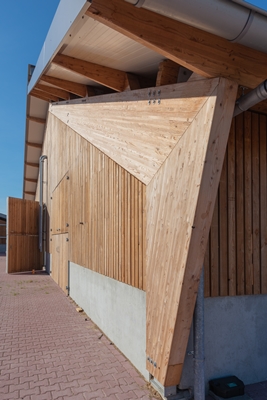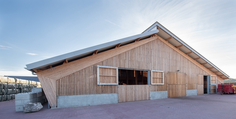 De gevels zijn gemaakt van een gelamineerde houtconstructie op een betonnen plint, met een verticale semi-open houten gevelbekleding. Onder de overstekken zijn op diverse plekken nestkasten opgenomen. De verspringende nok biedt een strook voor ventilatie en extra daglichttoetreding in de schuren. Het publiek kan vanaf een balkon een blik in de schuren en op de dieren werpen.