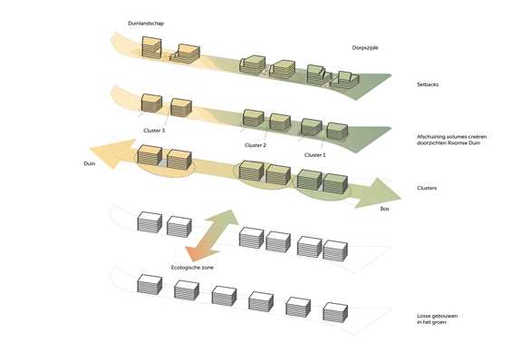 De gebouwen begeleiden de overgang van het dorp naar het strand. De eerste twee gebouwclusters richten zich meer op het dorp en het derde cluster is gericht naar het strand en de duinen. Tussen cluster twee en drie bevindt zich een grotere ruimte, de ecologische zone die zowel visueel als fysiek de verbinding tussen het Natura 2000-park Roomse Duin en de Langeweg vormt.