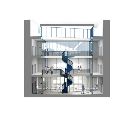 Door de kantoorunits en gemeenschappelijke ruimtes strategisch te verdelen over het gebouw, moeten ontmoeting en kennisuitwisseling worden gestimuleerd. Een centrale rol wordt hierbij weggelegd voor het restaurant en het vergadercentrum.
