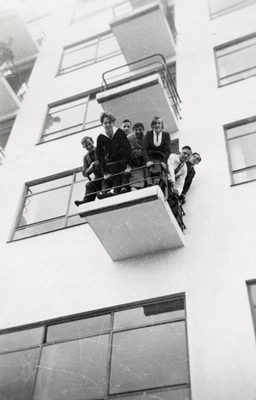 Bauhaus-studenten op een balkon van het Prellerhaus, de studentenhuisvesting van het Bauhaus