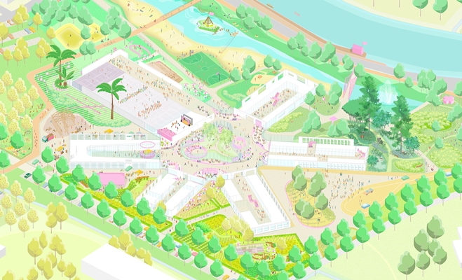 Het totale bouwprogramma omvat 16.600 vierkante meter. Alle gebouwen staan rondom een centraal hart, dat fungeert als ruimteverdeler, hoofdentree en ruimte voor gezamenlijke activiteiten. Het omliggende landschap loopt tussen de gebouwen door. De sport- en culturele functies worden zo geclusterd dat de scholen en andere partijen uit de omgeving er onafhankelijk van elkaar gebruik van kunnen maken, laten de betrokken bureaus weten.