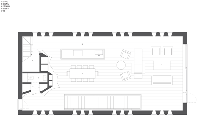 De begane grond biedt een royale leefruimte onder het gewelfde dak. In de ruimte staat een sculpturaal element, dat in vorm en materiaalgebruik enigszins refereert aan een kansel of een orgel. In deze verhoogde āstudieplekā kunnen bewoners zich desgewenst terugtrekken.