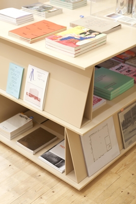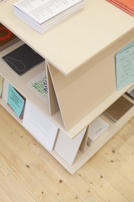 Door de hele ruimte in (nagenoeg) een kleur uit te voeren, hebben de ontwerpers de nadruk gelegd op het lijnenspel. De uitgestalde publicaties – overigens ook altijd verzorgd vormgegeven – hebben daarmee een rustige basis en brengen de accenten in het interieur.