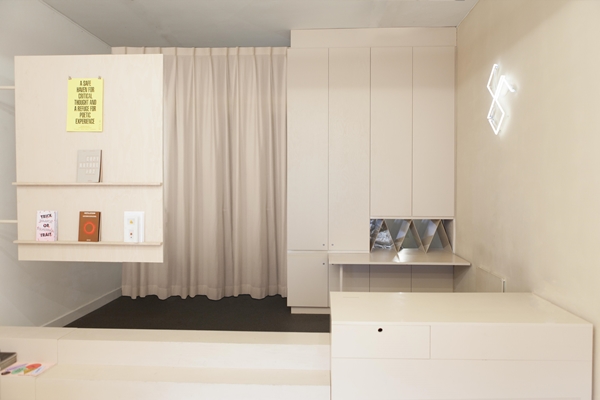 Een grote kast en gordijnen scheiden de galerie van de winkel. Bovendien bereikt de bezoeker de galerie alleen via centraal in de ruimte geplaatste treden. “Daardoor is de bezoeker zich bewust van het betreden van een nieuw gebied”, legt Keune uit. De kast biedt, boven een geïntegreerd bureautje, een doorkijkje naar de galerieruimte.