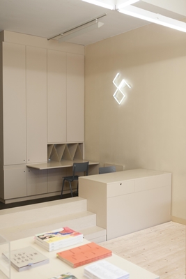 een nieuw interieur voor uitgeverij en galerie Onomatopee in Eindhoven ontworpen en gerealiseerd. Het interieur kenmerkt zich door een driedimensionale compositie van horizontale en verticale vlakken.