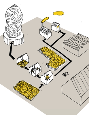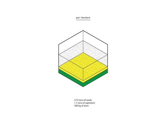 Het grootste deel van het gewas blijft ongebruikt. Echter, bewijst studio Thomas Vailly, de stengel, de schors en de donkerbruine eiwitten van de bloem kunnen waardevolle grondstoffen zijn voor nieuwe biomaterialen.