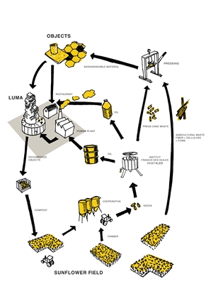 “Geen synthetisch bindmiddel, geen giftige vernis; alle noodzakelijke ingrediënten worden gewonnen uit de zonnebloemen”, stelt Vailly. “De zonnebloemoogst biedt een uniek assortiment bio-gebaseerd en biologisch afbreekbaar materiaal.”