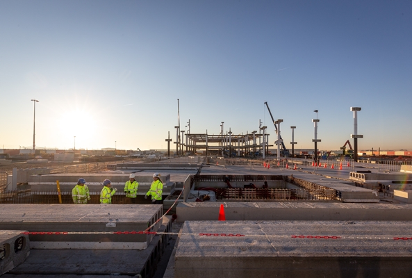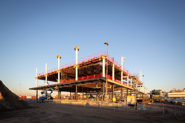 De kanaalplaten van de begane grond zijn grotendeels gelegd. De eerste secties van de staalconstructie zijn gemonteerd, deels tot het niveau van de gatehouses, die straks plaats bieden aan zowel narrow-body als wide-body vliegtuigen. Van de staalplaat-betonvloeren ligt het eerste staal, dat binnenkort wordt afgestort, aldus het architectenbureau.