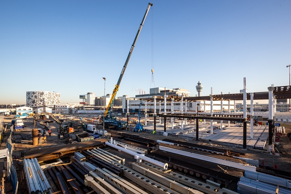 De bouw van de nieuwe pier op luchthaven Schiphol is aardig onderweg en de contouren van het gebouw beginnen zich al af te tekenen, meldt architectenbureau