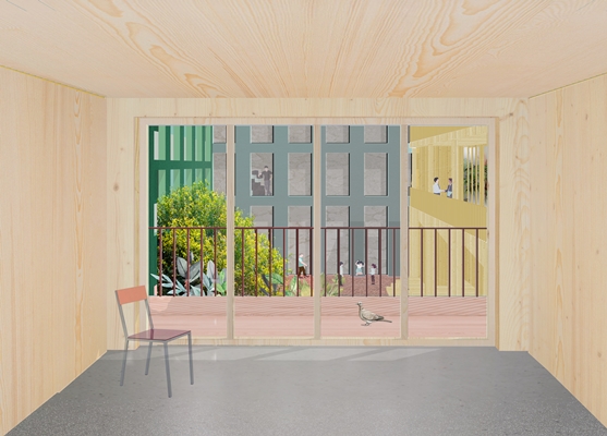 Ook noemde de jury het ontwerp van Urban Echoes origineel in zijn materiaal- en kleurkeuze. Het bureau stelt een roze houten hoekblok met rondgaande stalen balkons voor. De massief houten constructie zorgt voor een zeer duurzaam woonklimaat en een snel bouwproces, aldus het architectenbureau.