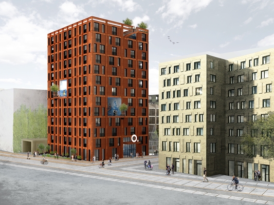 Woontoren voor jongeren op Oostenburg vormt roestbruin accent langs het spoor