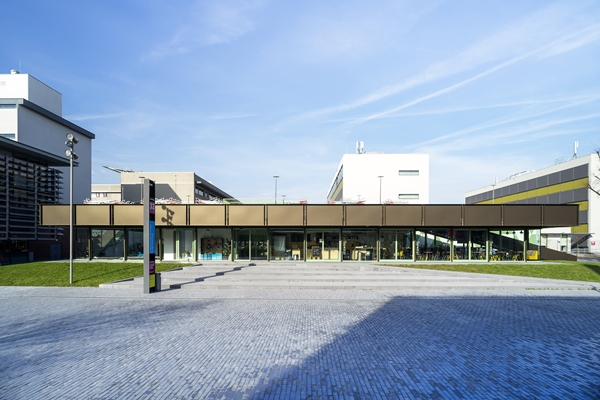 De Coffee and Bikes wordt omringd de aula en bibliotheek van de technische universiteit en het ook in 2018 geopende onderwijsgebouw