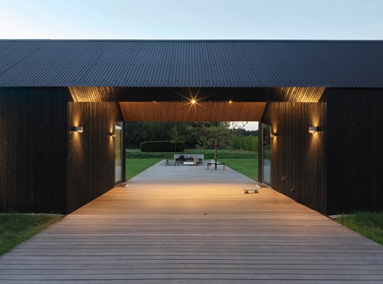 Open leefruimten achter een zwart houten gevel