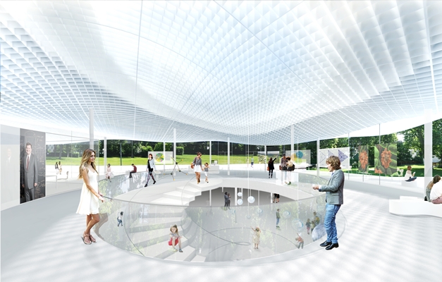 Boven de paviljoenachtige structuur ‘zweeft’ een zacht glooiend dak, dat zich uitstrekt in het park. Het dak verandert van structuur, legt het architectenbureau uit, “van transparant naar translucent en naar opaak, en weer terug.”